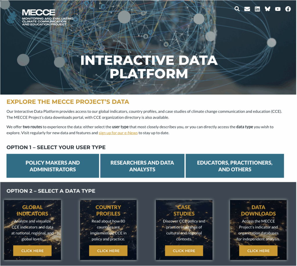 Our interactive data platform has new features! First, we now offer the ability to navigate the platform as a policy maker, researcher, or practitioner, with different functionalities to suit varied needs. When you select a user type, the website provides a recommendation about different features that may be of interest to you. The user interface of the global indicator analysis tool has also been simplified to be more user-friendly and a new ‘time series’ view allows users to explore changes in indicator data over time. Finally, MECCE Project data is now available for download through a new data downloads portal.