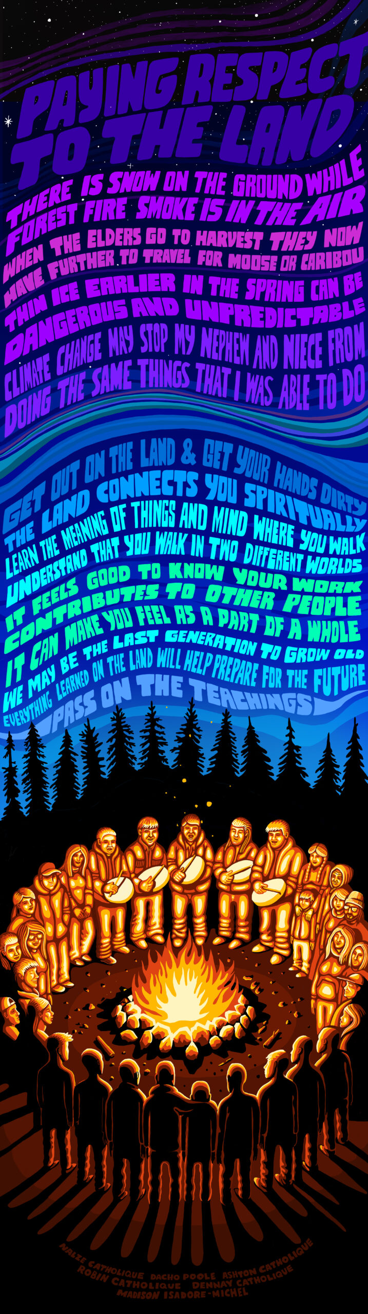 For the young people, respect is both a value and a practice. It involves everything from cleaning up after yourself to ensuring against over-harvesting. Respect also involves repaying the land through prayer, spruce boughs, and tobacco offerings. In the face of climate change, paying respect means learning to “read the land” and adapt to changes by learning from Elders’ stories and archives of Dene knowledge. The camps helped young people read the land and learn to care for it.