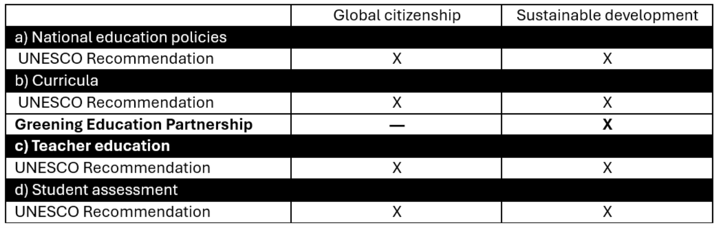 Up to that point, SDG global indicator 4.7 on sustainable development had one indicator measuring. the ‘Extent to which (i) global citizenship education and (ii) education for sustainable development are mainstreamed in (a) national education policies; (b) curricula; (c) teacher education; and (d) student assessment, which had been measured with self-reported country data, raising questions of validity and reliability.