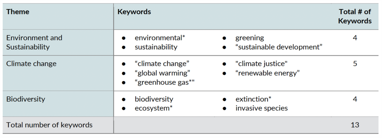 For each theme, 4-5 representative keywords were selected based on their relevance, translatability and prevalence. As per the table below, these include terms like environment(al), sustainability, climate change, greenhouse gas, biodiversity and ecosystem. The keywords have been translated into 40 languages and validated by experts. These words are aligned with the Greening Education Partnership’ curriculum guidance and its focus on six key concepts – climate science, ecosystems and biodiversity, climate justice, resilience-building, post-carbon economies, and sustainable lifestyles.