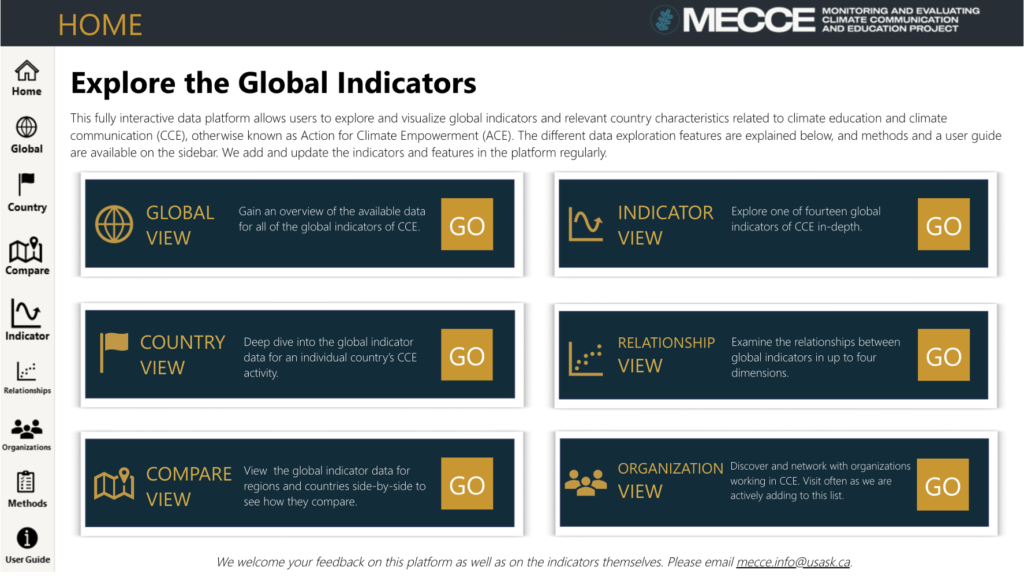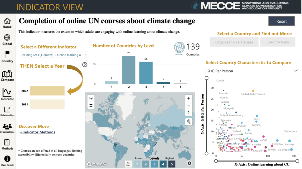 Our interactive data platform has a new look! We are thrilled to share an upgraded global indicator view of the platform, which was done in collaboration with Microsoft’s AI for Good and Catch Analytics. This powerful online interactive tool supports benchmarking and target-setting on climate communication and education (CCE), or Action for Climate Empowerment (ACE). The indicators can now be examined through global, regional, and country-level views, and the relationships to contextual factors such as country emissions and climate vulnerability can also be explored. Our country profiles and case studies are also available on the platform.