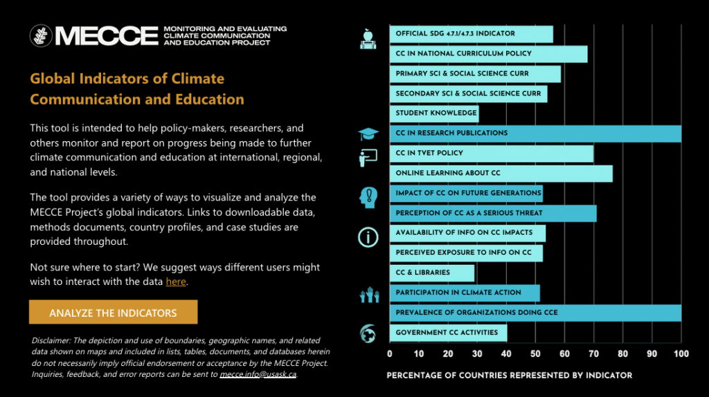 Data from Global Sustainable Development Goal Indicator 4.7.1b is now available on the interactive data platform. This indicator was developed by the MECCE Project in partnership with the Global Education Monitoring Report and UNESCO Institute for Statistics, and recently formally accepted by the UN. It measures greening content in countries’ national curriculum frameworks and grade 3, 6, and 9 science and social science curricula. The indicator analysis tool allows users to analyze and visualize the SDG indicator, as well as by national curriculum frameworks, primary education curricula, and secondary education curricula. We have also added an in-development indicator of the extent of education commitments in the action plans countries submit under the Paris Agreement, which are known as Nationally Determined Contributions. We welcome feedback on this provisional indicator.