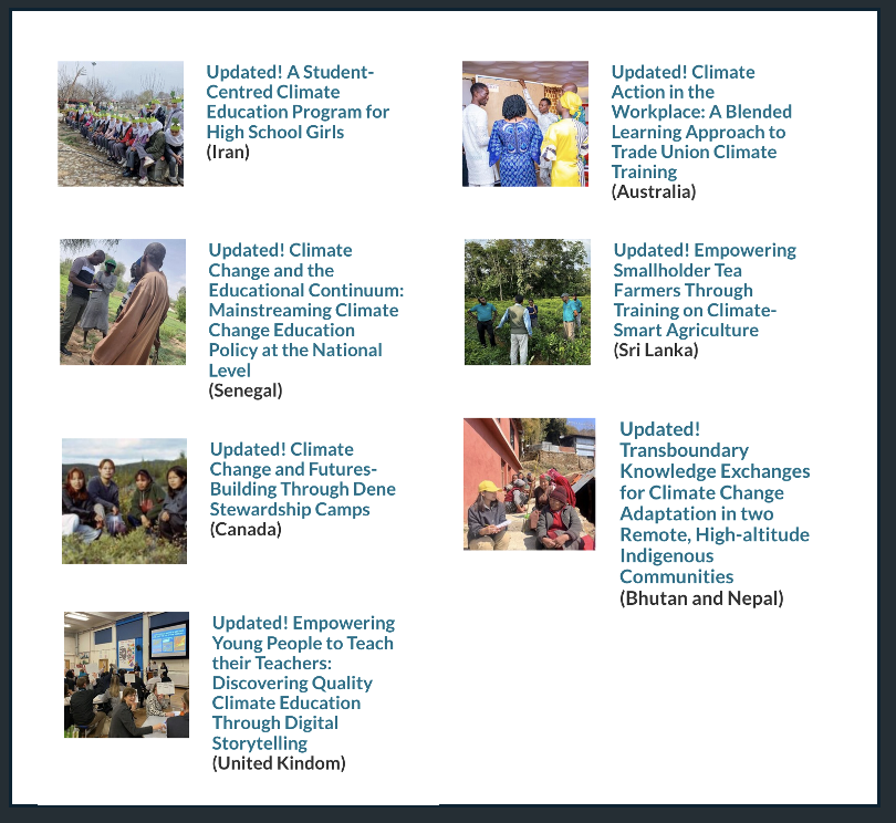 We are excited to announce that final reports from another round of funded case studies of quality CCE are now available! The case studies explore quality CCE approaches around the world–in schools in Iran and the United Kingdom, on Sri Lankan smallholder tea farms, on the land in a Canadian First Nation, across the Senegalese education and training system, and on trade unionists’ computers around the world. These case studies highlight the important role quality CCE plays in fostering hope, empowering locally-relevant climate action, building relationships with nature, supporting livelihoods, and taking policy action. Visit the interactive data platform to view summaries, reports, photos, and videos, or the digital library to read the reports.